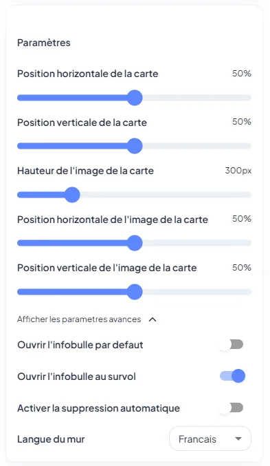 Milo vous offre un contrôle total sur l'apparence de votre Happy Wall. En descendant encore dans le panel de droite, vous trouverez des options de personnalisation très puissantes.