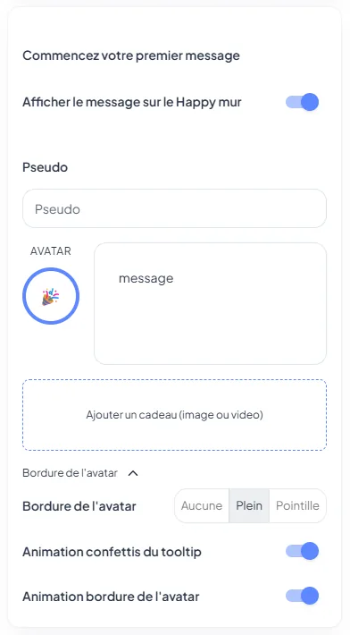 - Bouton "+ Ajouter un message" : Vos invités peuvent cliquer dessus pour laisser leur propre mot doux.